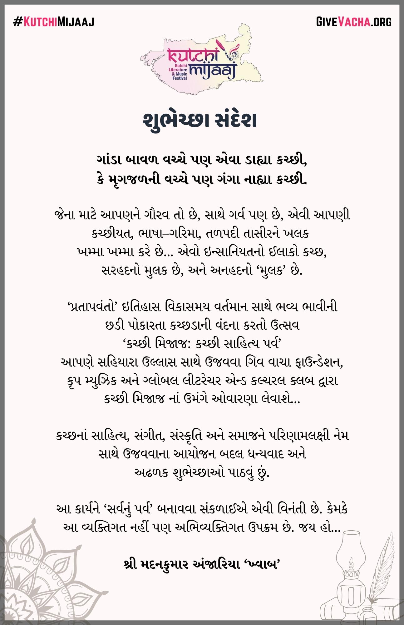 વરિષ્ઠ સાહિત્યકાર શ્રી મદનકુમાર અંજારિયા ‘ખ્વાબ’ એ આપી ‘ગુજરાતી મિજાજ: ગુજરાતી સાહિત્ય સંગીત પર્વ’ ને વિશેષ શુભેચ્છા