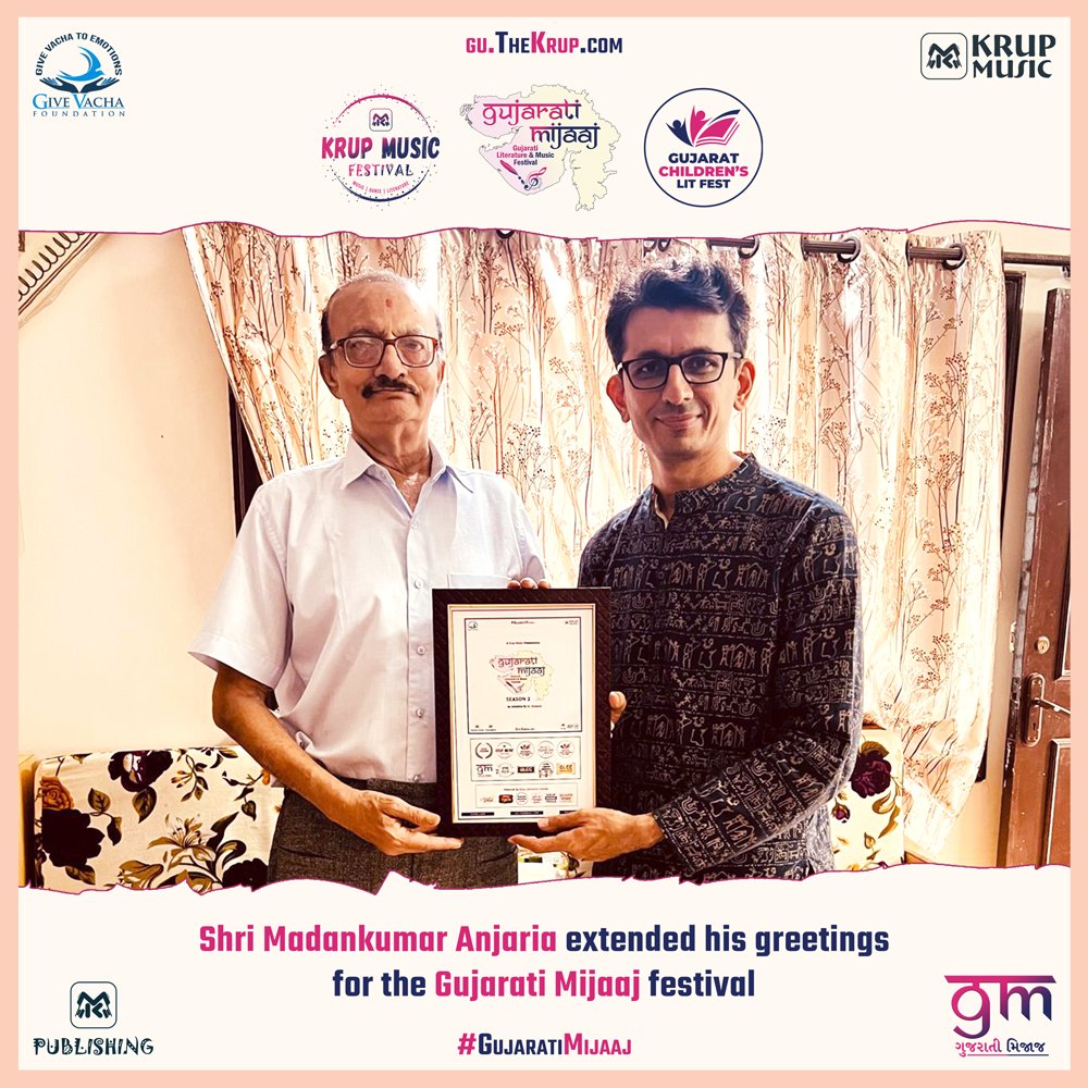 ગિવ વાચા ફાઉન્ડેશન, કૃપ મ્યુઝિક, ઇઝી આઈડી અને ગ્લોબલ લિટરેચર એન્ડ કલ્ચરલ કલબ દ્વારા વિશ્વના સૌથી લાંબા ગુજરાતી લિટરેચર એન્ડ મ્યુઝિક ફેસ્ટિવલ ‘ગુજરાતી મિજાજ’ નો શુભારંભ કચ્છ ખાતે થયું ત્યારે કચ્છના વરિષ્ઠ સાહિત્યકાર શ્રી મદનકુમાર અંજારિયા એ ફેસ્ટિવલ ડાયરેક્ટર ડૉ. કૃપેશ ઠક્કર અને ડૉ. પૂજા ઠક્કર ને વિશેષ શુભેચ્છા સાથે આશીર્વાદ આપ્યા. ‘ગુજરાતી મિજાજ’ ની છબીનાં અનાવરણ સાથે તેમણે આ સાહિત્ય સંગીત પર્વના ભવ્ય આયોજનની સરાહના કરી.